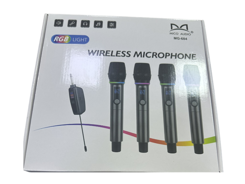 Σετ ασύρματων μικροφώνων Mico Audio MG-684 με φωτισμό RGB για επαγγελματική ή οικιακή χρήση.Ιδανικό για karaoke, παρουσιάσεις και εκδηλώσεις, με σταθερή σύνδεση και καθαρό ήχο χωρίς παρεμβολές.Χαρακτηριστικά: