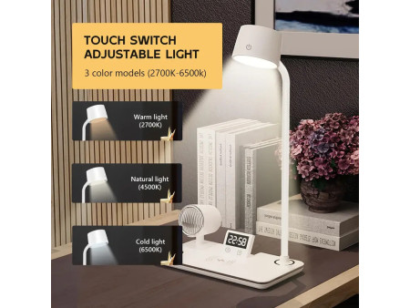 4-in-1 LED Desk Lamp, Wireless Charger, Sound Speaker, Touch Control, Clock, Adjustable Height, USB Powered