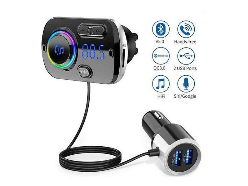 Πομπός FM αυτοκινήτου με υποστήριξη Bluetooth, USB, κάρτας TF (έως 32 GB) και έλεγχο μέσω συχνότητας 87.5-108 MHz. Διαθέτει 2 θύρες USB γρήγορης φόρτισης, μήκος καλωδίου 110 cm και εμβέλεια Bluetooth έως 10 m. Χαρακτηριστικά: