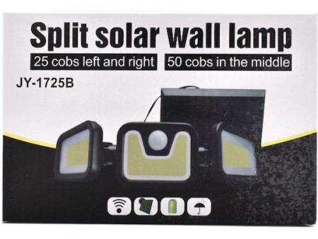Ο ηλιακός προβολέας JY-1725A διαθέτει 3 περιστρεφόμενες κεφαλές και είναι εξοπλισμένος με 70 LED, χαρακτηριστικό που του προσδίδει εξαιρετικά αποδοτικό φωτισμό. Με τον ανιχνευτή κίνησης του, ο προβολέας θα ενεργοποιηθεί μόλις εντοπιστεί μια παρουσία στο πεδίο του, ενώ περιλαμβάνει ηλιακό πάνελ για να φορτίζει όλη την ημέρα.