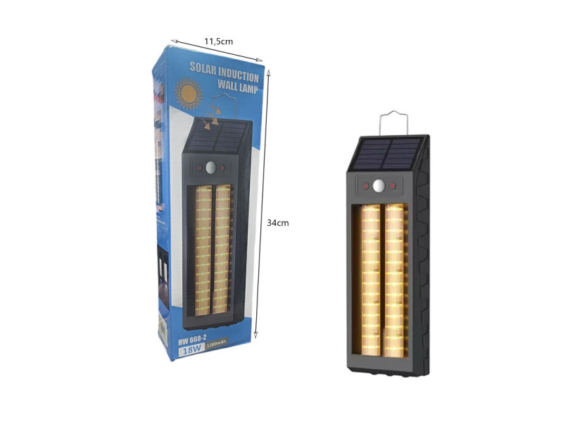 Το ηλιακό φωτιστικό HW668-2 18W παρέχει ισχυρό φωτισμό με δύο σωλήνες LED και ενσωματωμένο αισθητήρα κίνησης. Διαθέτει μπαταρία 1200mAh για μεγάλη διάρκεια και λειτουργεί πλήρως αυτόνομα, φορτίζοντας με το φως της ημέρας. Κατάλληλο για αυλές, τοίχους, εισόδους και διαδρόμους.