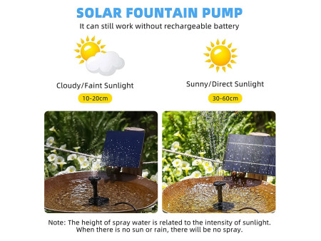 This product is a solar direct-drive water pump without an external battery. The height of the water spray depends entirely on the strength of the sun. When the sun is weak, the water pump will not work continuously, but will automatically start repeatedly until the sun reaches a certain intensity, and it will automatically resume continuous work.
