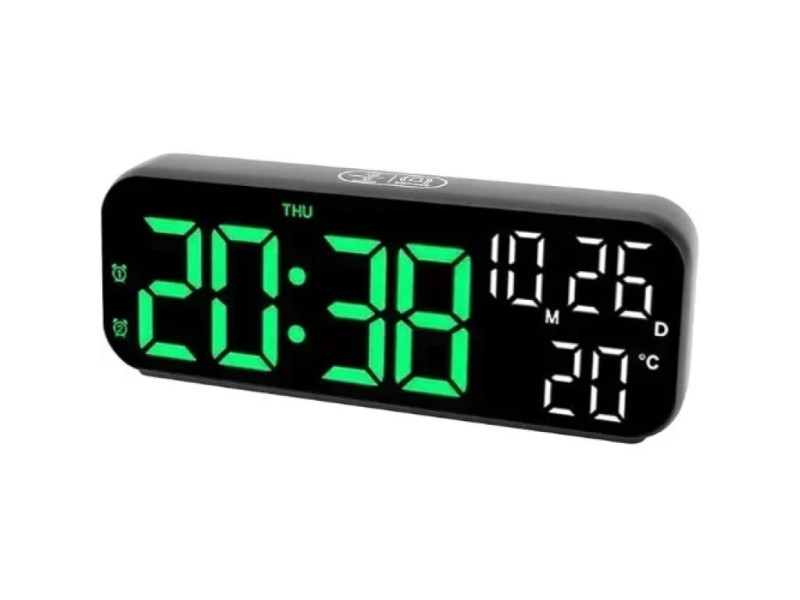 Μοντέρνο ψηφιακό ξυπνητήρι με φωτεινή πράσινη LED οθόνη, ιδανικό για υπνοδωμάτια, γραφεία ή χώρους εργασίας. Εμφανίζει ώρα, ημερομηνία και θερμοκρασία περιβάλλοντος με υψηλή ευκρίνεια. Διαθέτει λειτουργία αφύπνισης και ρυθμιζόμενη φωτεινότητα για κάθε συνθήκη φωτισμού.