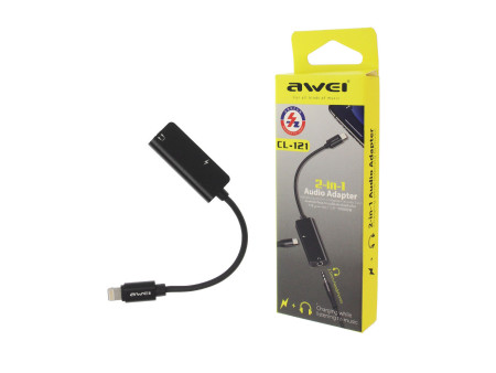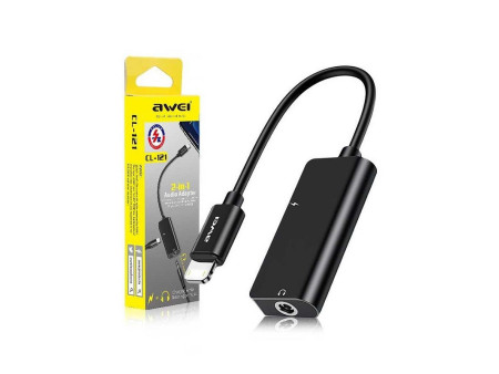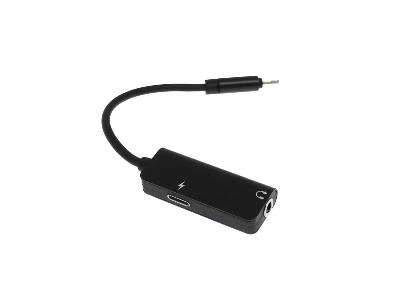 Αντάπτορας που συνδέει έναν αρσενικό ακροδέκτη Lightning με μια θηλυκή θύρα 3.5mm και μια Lightning.