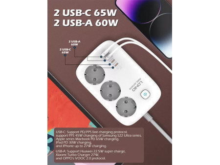 Ταχεία Φόρτιση 65W Υψηλής Ισχύος: Αναγνωρίζει έξυπνα τη συσκευή φόρτισης, εξασφαλίζοντας αποτελεσματική φόρτιση για smartphones και tablets.